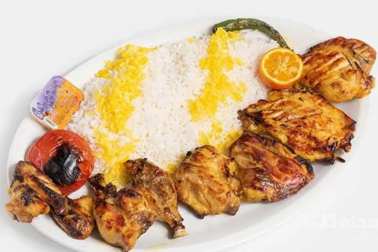 یک سیخ جوجه کباب با استخوان، برنج ایرانی، گوجه کبابی