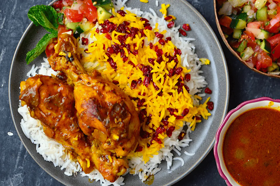 یک ران مرغ پخته شده در سس رب گوجه فرنگی به همراه زرشک پلو
