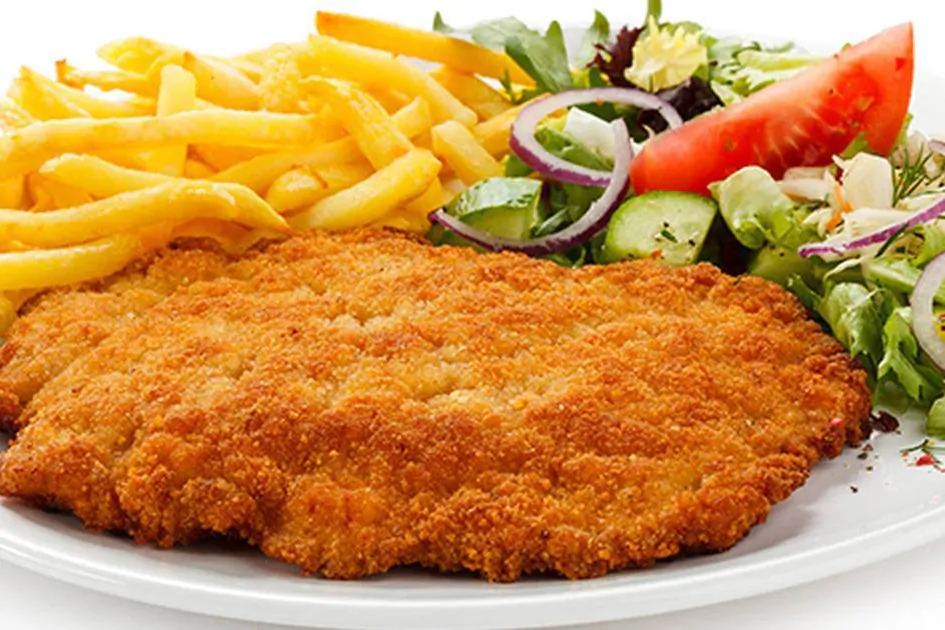 سینه مرغ سوخاری شده با دورچین سیب زمینی سرخ کرده و سالاد